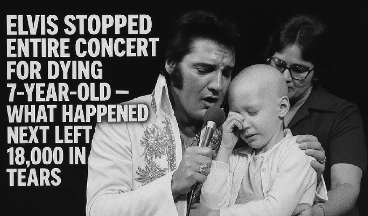 In the vast history of Elvis Presley’s legendary live performances, few moments reveal the depth of his heart quite like the night he stopped an entire concert for a dying 7-year-old child. The story, retold in a powerful video that continues to circulate among fans worldwide, reminds us that behind the voice, behind the fame, there was a man whose compassion could silence an arena of 18,000 people.